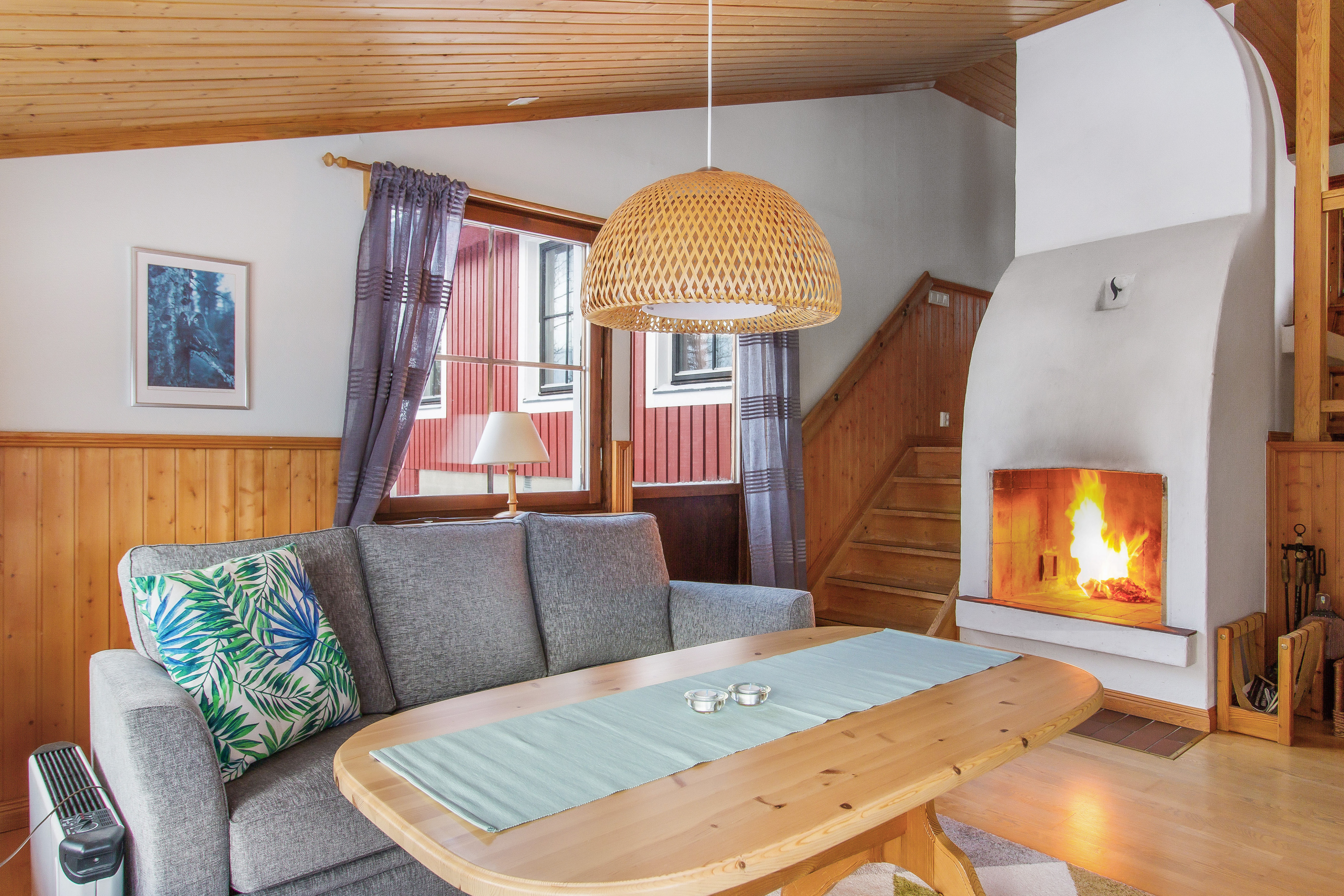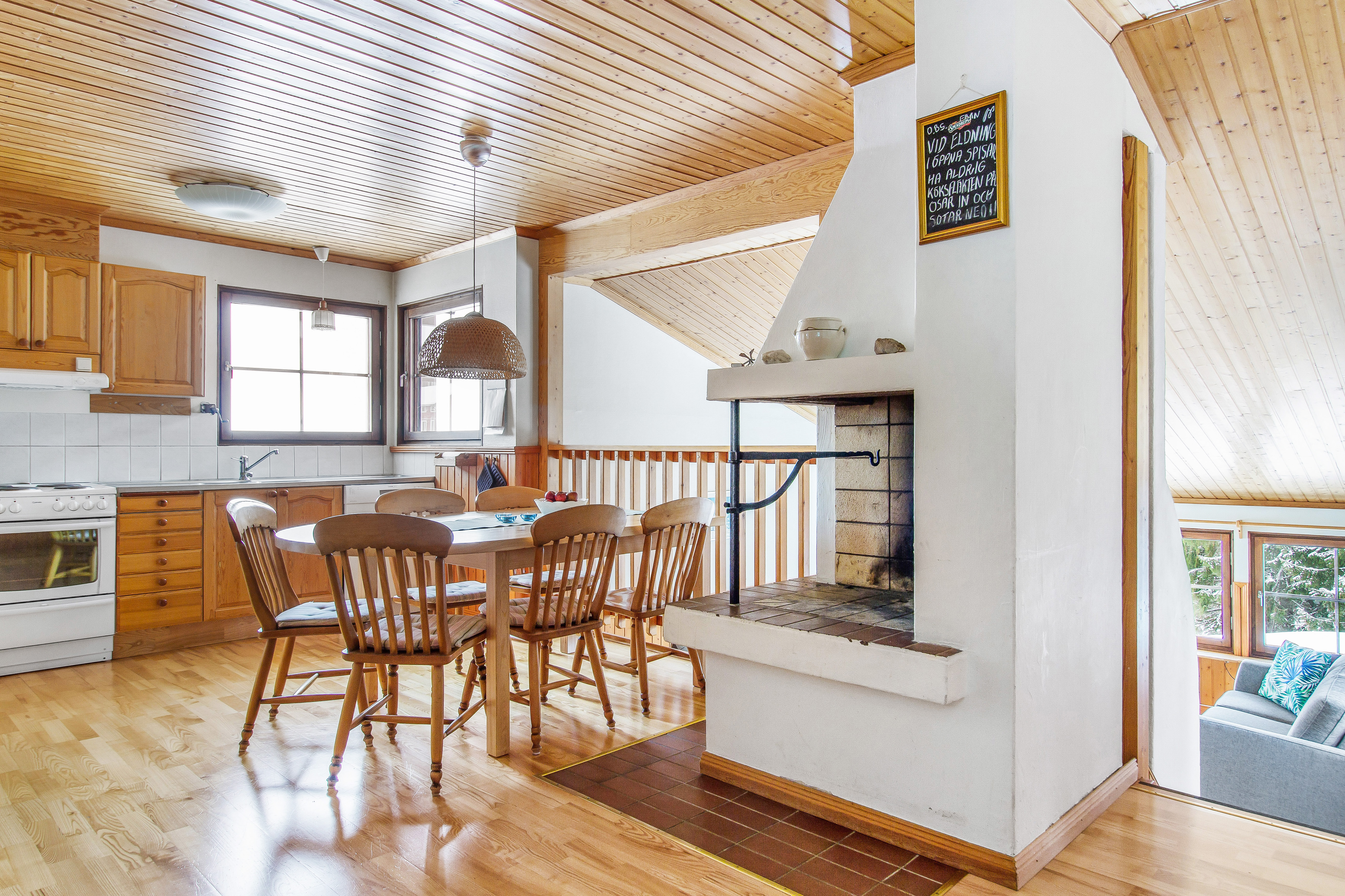 Här bor det lite större sällskapet bekvämt i tre sovrum och dusch/wc en trappa upp samt kök och vardagsrum med öppen spis på entréplan.